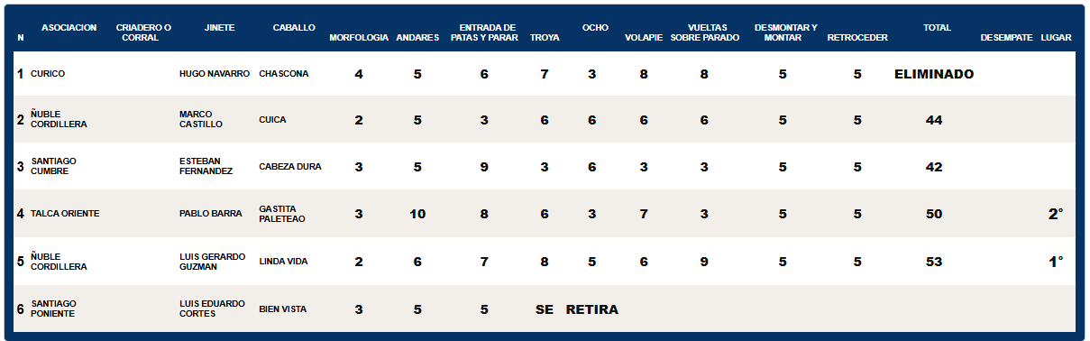 También compitieron Marco Castillo (Ñuble Cordillera) en Likén Cuica con 44 puntos, Esteban Fernández (Santiago Cumbre) en Tavorí Cabeza Dura con 42; Luis Eduardo Cortés (Santiago Poniente) en Palmas de Peñaflor Bien Vista, que se retiró por lesión; y Hugo Navarro (Curicó) en La Espuelita Chascona, que fue eliminada.