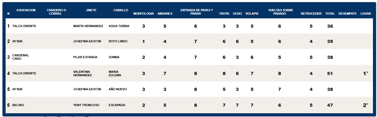 También compitieron Josefina Easton (Chiloé) en dos ejemplares: Cerro Chico Roto Lindo con 39 unidades y Río Turbio Año Nuevo con 38; Pilar Estrada (Cardenal Caro) en Los Cardenales Zumba con 38; y Marta Hernández (Talca Oriente) en Santa Bernardita de Romeral Agua Turbia con 36.